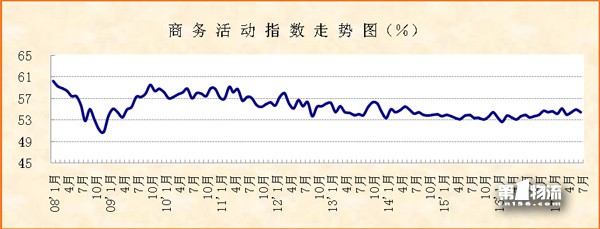 中国物流与采购联合会、国家统计局服务业调查中心发布的2017年7月份中国非制造业商务活动指数环比小幅回落,但整体波动幅度不大,连续十个月保持在54%以上;新订单指数连续两个月稳定在51%以上;销售价格指数连续两个月环比上升,本月升至50%以上;从业人员指数小幅回落0.1个百分点,连续六个月稳定在49%以上;业务活动预期指数持平,指数保持在61%以上的高位。市场供需、价格和就业的持续性变化反映非制造业持续较快发展的势头未变。