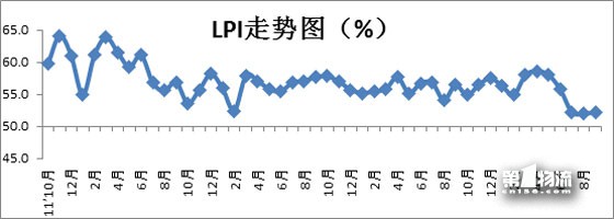 中国物流与采购联合会发布的2015年9月份中国物流业景气指数(LPI)为52.2%,比上月升0.2个百分点。各分项指数中,除平均库存量指数、资金周转率指数和主营业务利润指数较上月回落,其他分项指数较上月有不同程度回升。