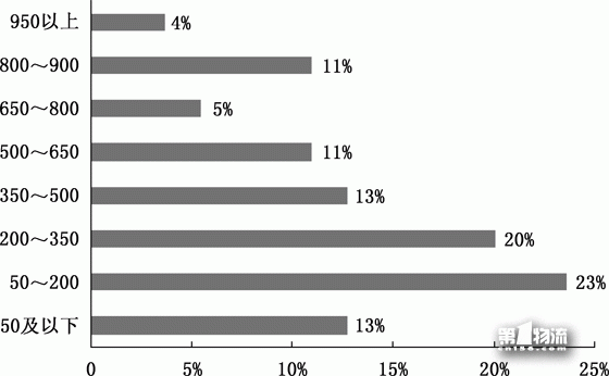 物流园区公共信息平台投入占园区实际投资的比例平均为7.9%,而园区软件系统投入占公共信息平台投入的比例平均为54.6%。物流园区公共信息平台投入规模分布情况如图13所示。